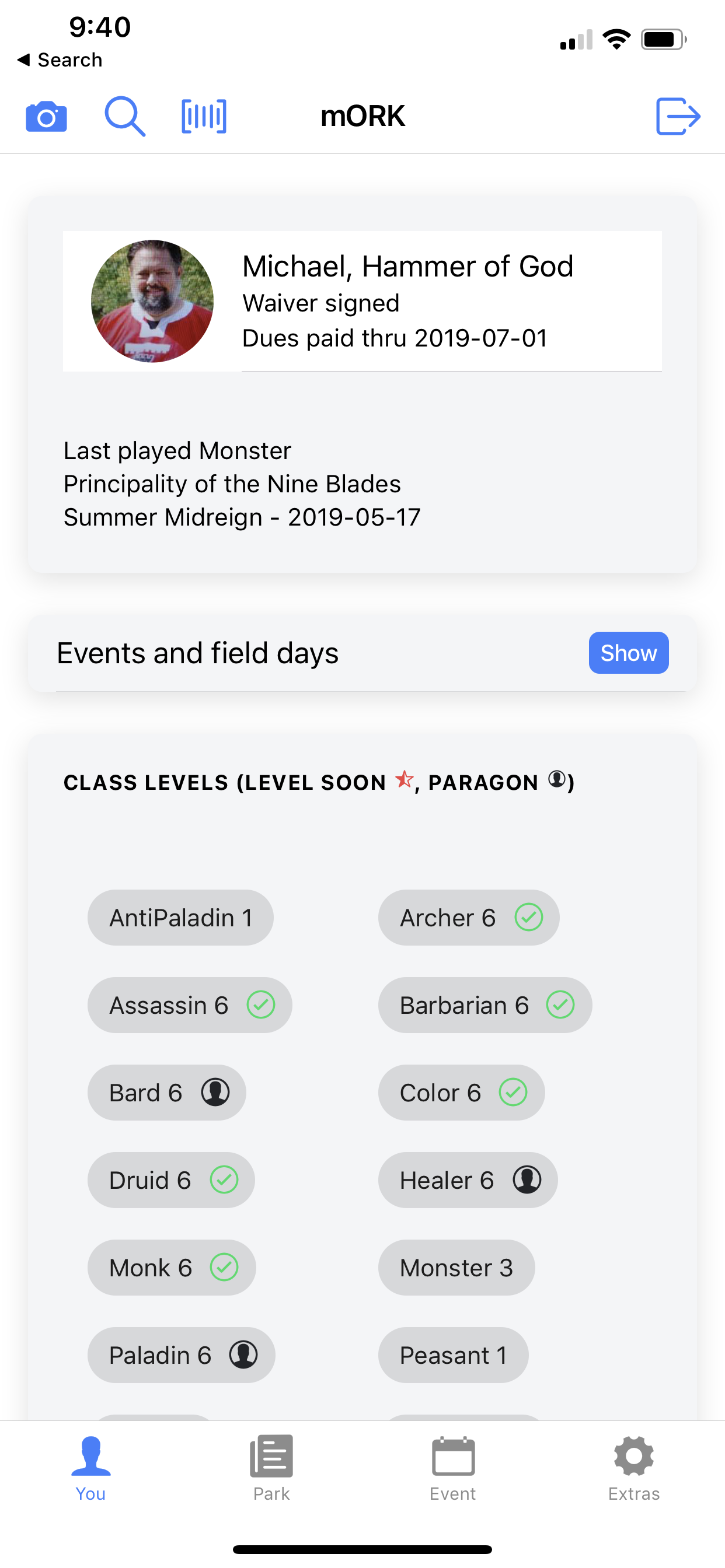 mORK is a mobile application for the players and Chancellors of Amtgard. mORK allows players to see a summary of their character and to easily upload a new ORK photo of themselves. mORK also allows a player to display a QR code of their account to their Chancellor for easy sign-in.